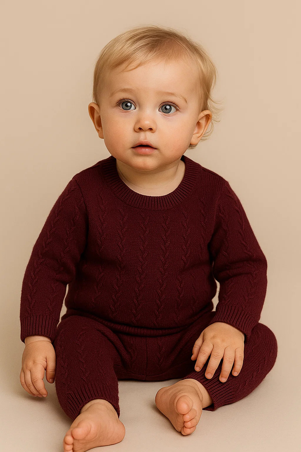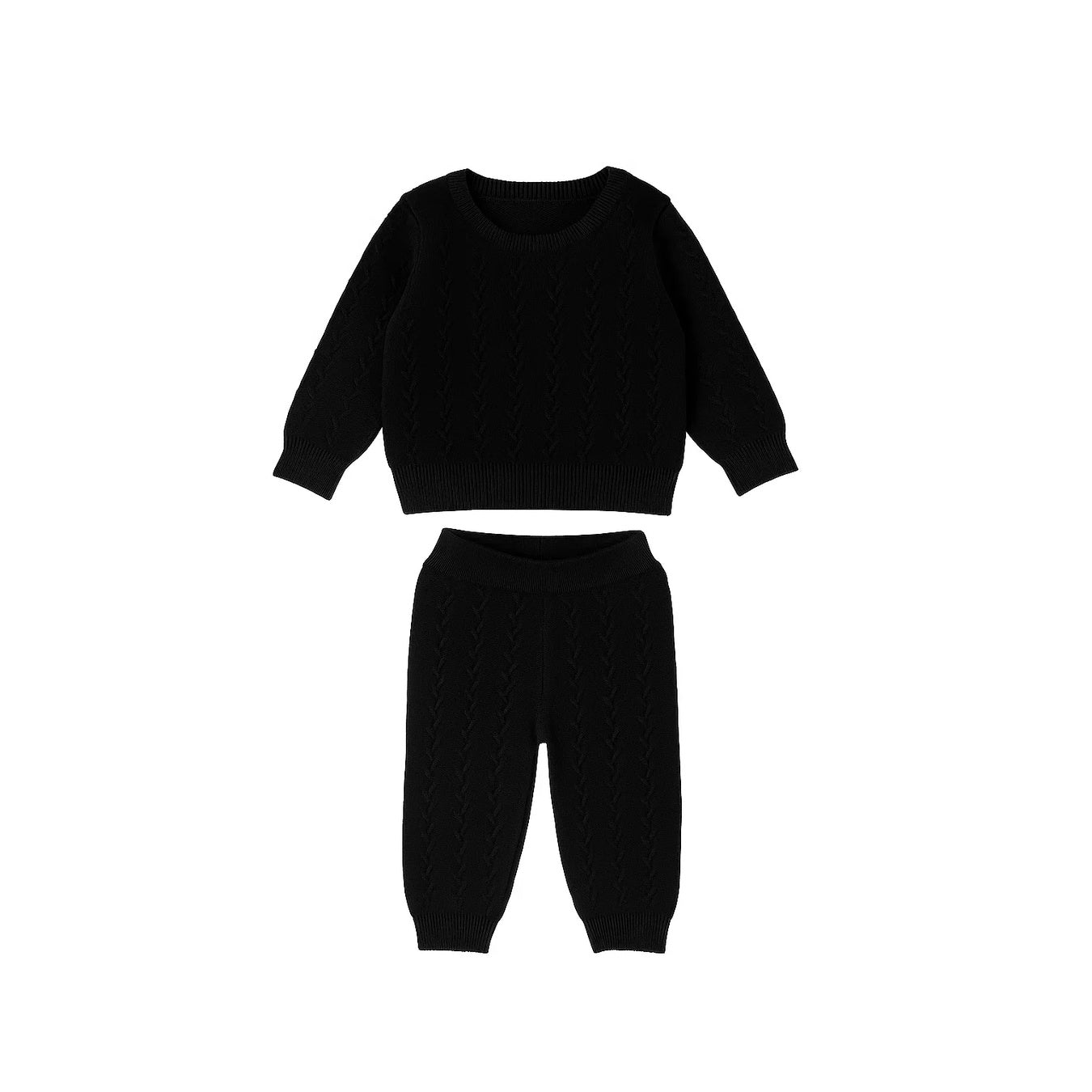 A cozy matching set designed for little ones. This baby cable knit set includes a long sleeve pullover sweater and coordinating pants, both made from soft knit fabric with a classic cable pattern. The sweater features ribbed trim at the collar, cuffs, and hem, while the pants have a comfortable elastic waistband and ribbed ankle cuffs. Perfect for everyday wear or special occasions, this set combines comfort and timeless style.