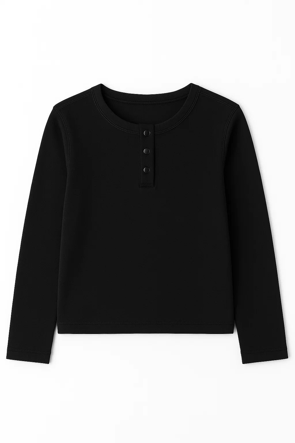 This long-sleeve top is designed with a modest crew neckline that sits close to the neck, finished with a 3-snap placket for a clean look. Made from soft, breathable fabric, it’s perfect on its own or paired with the matching Teen Seam Skirt for a coordinated set.