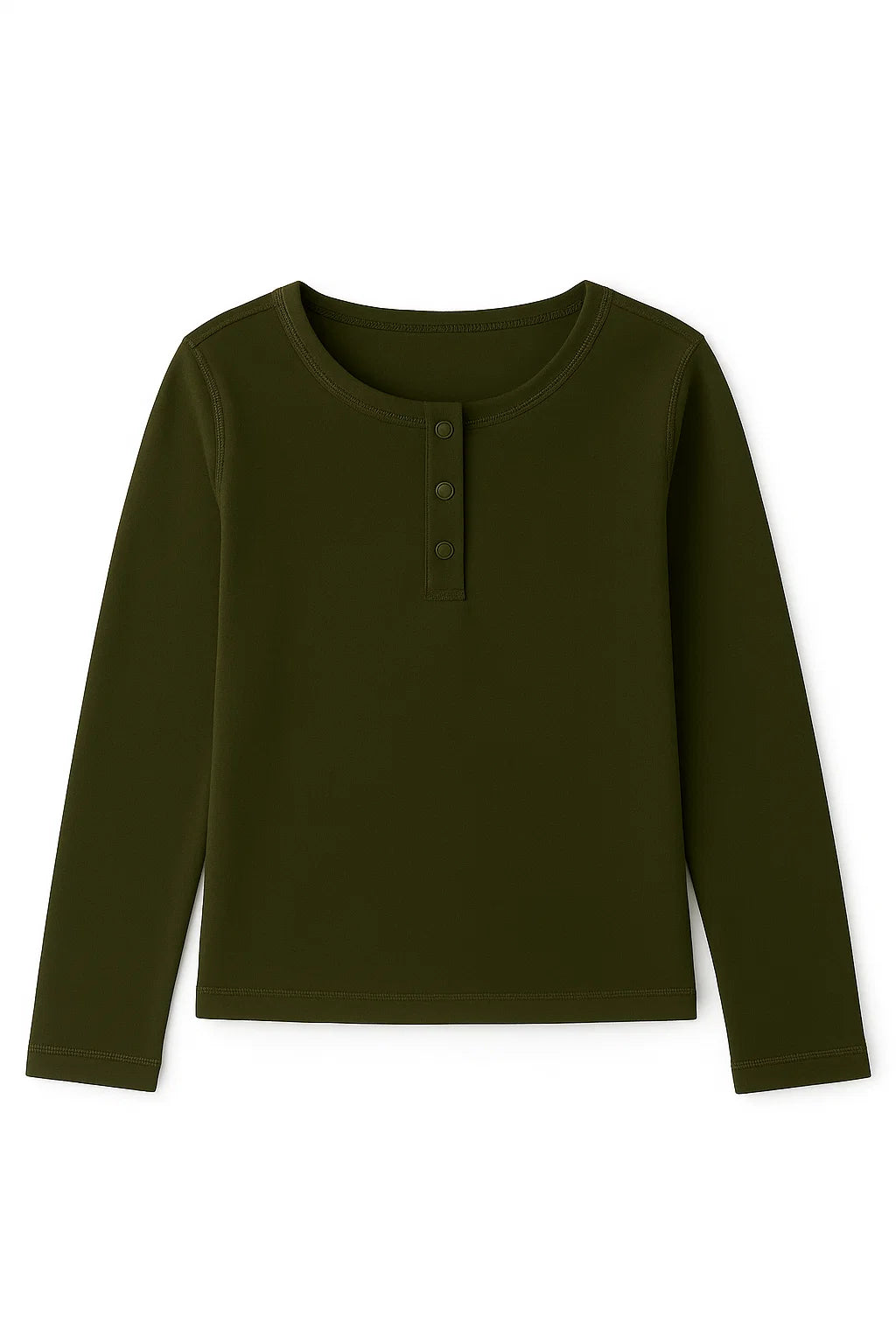 This long-sleeve top is designed with a modest crew neckline that sits close to the neck, finished with a 3-snap placket for a clean look. Made from soft, breathable fabric, it’s perfect on its own or paired with the matching Teen Seam Skirt for a coordinated set.